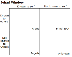 Here’s a quick exercise you can do to learn some of what is in each section: Choose a handful of adjectives that you think describe you from a large list (50-100), then ask your team to each choose a handful of adjectives they feel describe you. The ones that both you and your team members selected are your “Open Self” which is the part of you that is known to both you and others. The words only you chose for yourself describe your “Hidden Self”, which is known to you but not others. Those adjectives only your team chose indicate your “Blind Spot” or “Blind Area”, aspects of your personality that are known to others but not to you.